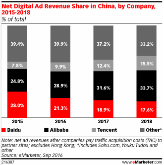 在國內,把持數字廣告市場的則是 BAT 三巨頭。市場研究公司 eMarketer 在最近發布的報告中稱,阿里巴巴、百度和騰訊共同占據了中國數字廣告市場 60% 的份額。預計阿里巴巴將超越百度,成為中國數字廣告市場上最大的玩家。