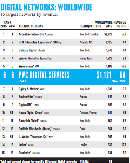 在很多人看來,戰略咨詢才是屬于咨詢公司的業務范疇。而事實上,咨詢公司與廣告公司的界限正在日益模糊。根據廣告媒體 Adage 發布的榜單顯示,埃森哲互動、IBM 互動體驗部、德勤數字和普華永道數字已經躋身世界 10 大數字營銷集團之列。而在 2011 年,上榜的咨詢公司還僅僅只有IBM。