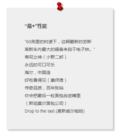 用一句話或一個詞語,表達出品牌的某種極致屬性、品牌檔次地位、品牌的極致理念追求、品牌的最優(yōu)市場表現(xiàn)。