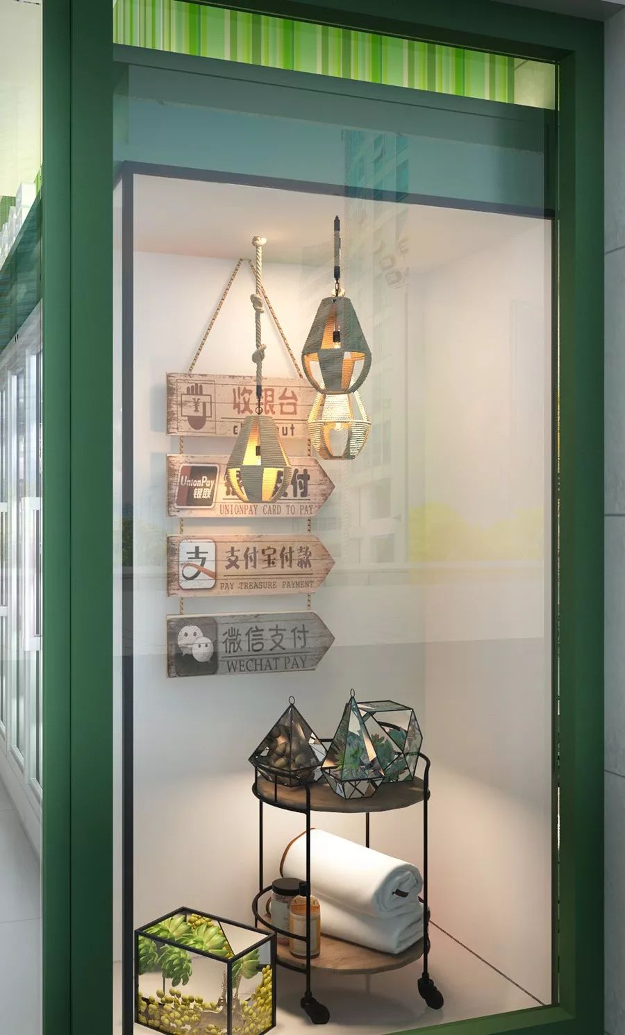 在柱體、墻面、貨架、吊頂等多處位置增加了黑色鐵藝的使用,復古風味不經意間顯露出來,也讓小清新的風格基調中多了分率性瀟灑。